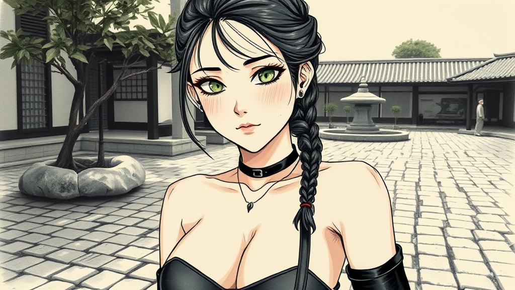 A full body Symbolist ink wash painting of a 24-year-old Yao-Greek female edgy rocker girl with a warm, inviting expression in anime style. Her supple, hydrated skin is plump, exuding a youthful radiance. The subtle makeup enhances her natural beauty, with a hint of blush on her cheeks and a soft pink shade gracing her lips. Her piercing, calm muted green eyes, shaped like inverted triangles, are framed by long, elegant eyelashes. Her neatly shaped eyebrows complement her delicate facial features, emphasizing her animated expressions. She has her hair styled in a braided bun, giving her an elegant yet edgy appearance. Her strong, muscular arms boast lean, defined lines, and her toned abs are visible beneath her cybernetic enhancements and accessories. Sporting a small breast, her midriff is exposed, and she stands in a "Yare Yare" pose, exuding nonchalance. Behind her, a tranquil Zen garden with meticulously raked sand patterns sets a serene backdrop. The scene, reminiscent of Shōji Kawamori's vibrant, detail-rich works, captures the essence of a modern studio anime aesthetic with key visual elements and a touch of creative flair.