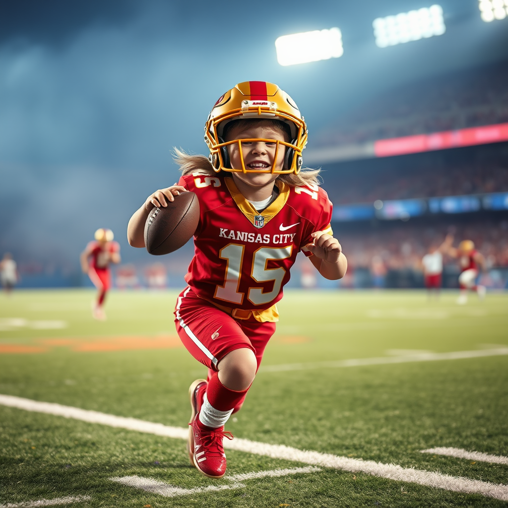 A full-body toddler, looking like a playful fusion of Taylor Swift and an American football star, is clad in a vibrant red and gold Kansas City uniform and helmet. The toddler is mid-action on the football field, joyfully running with a football in hand, exuding excitement as they score a touchdown. The scene captures the triumphant celebration of victory, with the toddler's face filled with pure delight. Dramatic lighting highlights the energetic motion and dynamic pose, adding to the hyper-realistic and detailed atmosphere. The professional photo is rendered in high definition, as if shot on a Canon EOS-1D X Mark III, showcasing a lively and magical moment frozen in time.