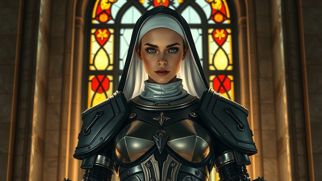 A full-body view of a devout woman warrior, set in an action scene, standing confidently before a stained glass window. Her symmetrical face is detailed, with reflective eyes, dark eyebrows, and light makeup. Clad in sci-fi nun armor reminiscent of the Warhammer 40k style, she is framed by marble walls and illuminated by dramatic chiaroscuro lighting, capturing dust particles in the air. The scene is from an elevated perspective, rendered as a professional oil painting inspired by artists like Waterhouse, John Constable, and Ed Blinkey. It carries influences from Studio Ghibli, Jeremy Mann, and Greg Manchess, creating a majestic impressionism effect. The intricate, high-detail depiction is trending on ArtStation and CGSociety. The armor combines elements of medieval design, while maintaining a steel-like finish. The image is free of distortions, featuring well-proportioned anatomy, with high clarity and vibrant yet natural colors, achieving a harmonious, visually stunning portrayal.
