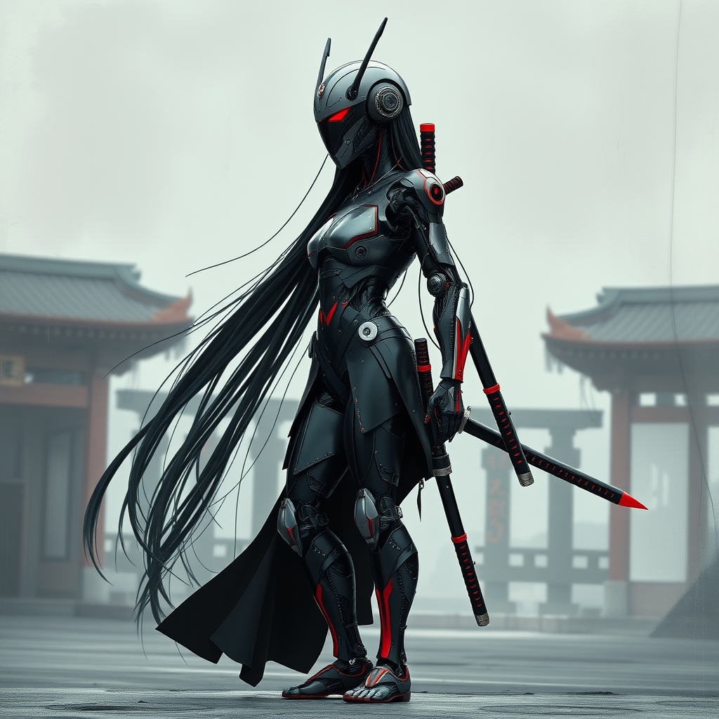 A full-body view of a female cyberpunk robot samurai in the style of ck-sfc, featuring a robot face with a mirrored face shield and a hyperdetailed helmet. Her flowing black hair cascades down her back, complementing her reflective black and neon red armor. Intricate robot joints and a sleek body composed of metals, cables, and wires are visible. She stands barefoot, with a katana artistically strapped to her back. The scene is set against an abstract background that hints at an eastern temple, incorporating subtle futuristic elements to enhance the cyberpunk atmosphere.