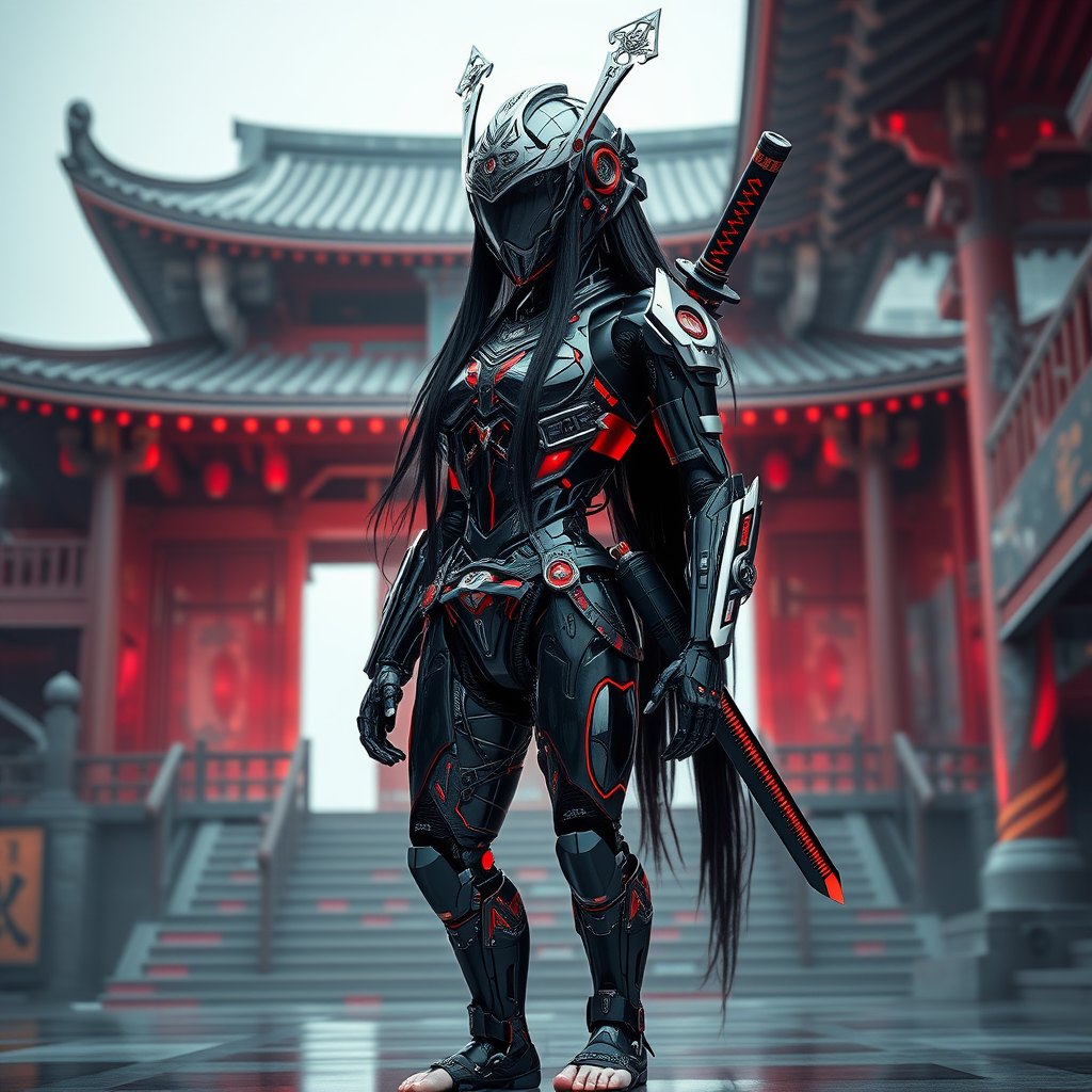 A full-body view of a futuristic female cyberpunk samurai robot, featuring a sleek, mirrored face shield that conceals her features. Her hyperdetailed helmet is adorned with intricate designs, allowing long, flowing black hair to cascade down. She is clad in reflective black armor accented with striking neon red highlights, showcasing meticulously crafted robot joints. Her body is an artful blend of gleaming metals, intertwined with cables and wires, exuding a sense of high-tech elegance. She stands barefoot, with a sharp katana elegantly strapped to her back. The background is an abstract homage to an eastern temple, merging ancient architecture with a modern, digital twist.