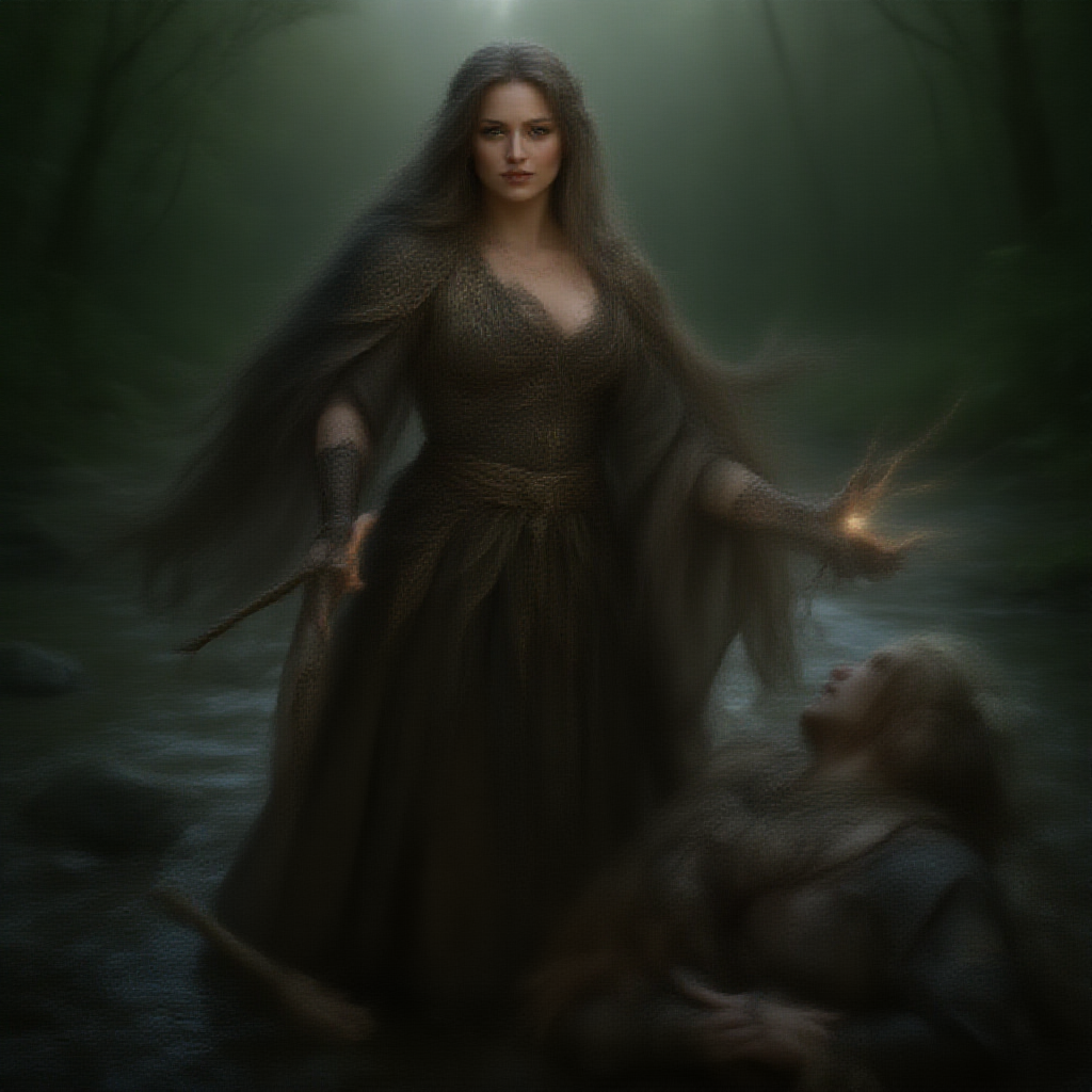 A full-figured female elf with long flowing hair and intricate druidic tattoos stands by a shimmering river, her hands glowing as she heals her injured companion. Inspired by the character Elira from Dragonlance, she embodies wisdom and strength, fully engaged in the intensity of battle. Her eyes are detailed and expressive, her facial features fine and captivating. This scene, rendered in an 8k photorealistic style, captures a masterpiece of nature and magic. The setting is envisioned by artists Jeremy Mann, Sandra Chevrier, and Maciej Kuciara, with sharp details and realistic shadows that lend a three-dimensional allure. The depiction avoids low resolution elements, exaggerated anatomical features, or any elements beyond what is essential for a realistic portrayal.