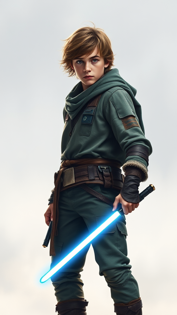 A full-length depiction of a young hero reminiscent of Luke Skywalker from "Star Wars" stands on a serene light background. He has an adventurous gaze and wears futuristic, rugged clothing with subtle aurora-like hues. His tousled hair catches a soft wind, and a glowing blue energy saber is firmly held in his hand. The atmosphere around him is calm yet charged with the promise of epic adventures. The artwork emphasizes realism, capturing intricate details in his attire and the energy saber's gentle glow, adding a hint of mysticism to his poised figure.