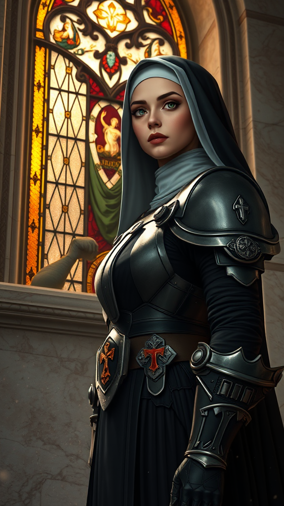 A full-length image of a devout Sister of Battle, in a dynamic pose, stands before a stained glass window, showcasing her beautiful and detailed symmetrical face. Her reflective eyes are accentuated by dark eyebrows and subtle makeup. She is clad in sci-fi nun armor, depicting a Warhammer 40k style. The scene is set against marble walls, with dust particles visible in the air, and features intricate lighting effects, including rim and dramatic chiaroscuro lighting, creating a magnificent atmosphere. The perspective is from above, giving a majestic impressionistic feel, reminiscent of oil paintings by masters such as Waterhouse, John Constable, and Jeremy Mann. The artwork draws influence from Studio Ghibli and is vibrant on platforms like ArtStation and CGSociety. The image features steel and medieval-inspired armor, and utilizes a distinctive art style with influences from Makoto Shinkai and Kyoto animation. The scene is high detail and intricate, with two characters interacting, avoiding any distortions or disproportionate features.