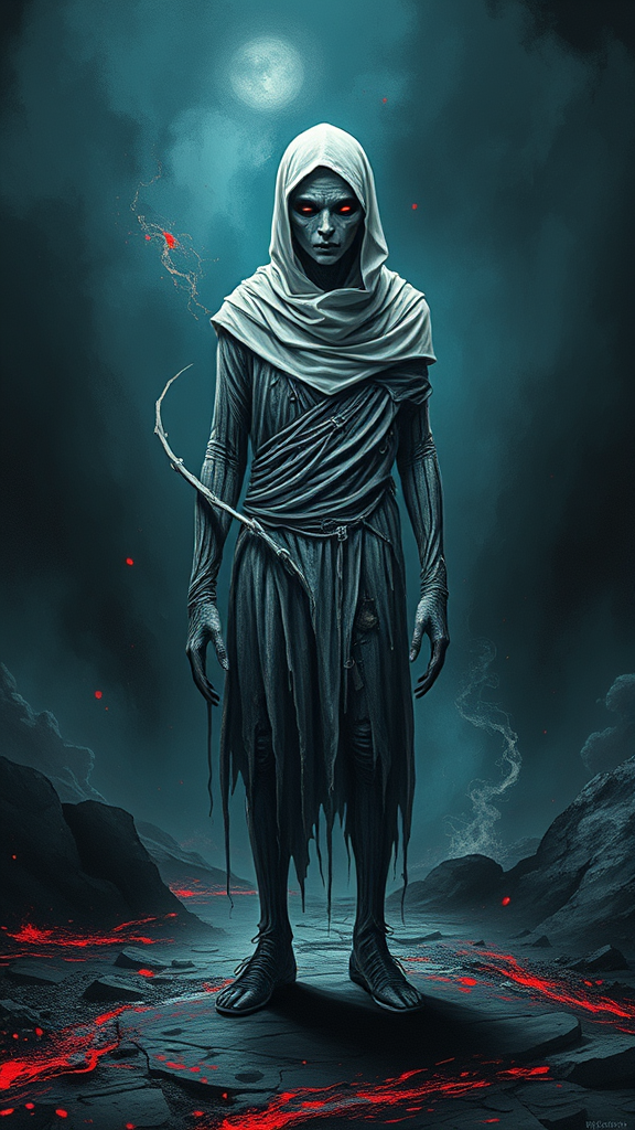 A full-length image of a ghostly figure in futuristic ragged clothing, standing ominously amidst a desolate landscape. The creature's haunting presence is amplified by its cold, terrifying pupils and piercing gaze. The background swirls with an evocative color scheme of deep blues, shadowy blacks, and flashes of unsettling reds, reminiscent of a dystopian dreamscape. The scene captures the unsettling essence of surrealist expressionism, with distorted shapes and otherworldly textures blending seamlessly in mixed media. Fragmented pieces of metal and fabric cling to the figure's body, telling a silent story of survival in a forsaken future. Small, eerie details emerge upon closer inspection—like ghostly hands reaching from the shadows or wisps of smoke curling up from the ground—adding layers of mystery and fear to the artwork.