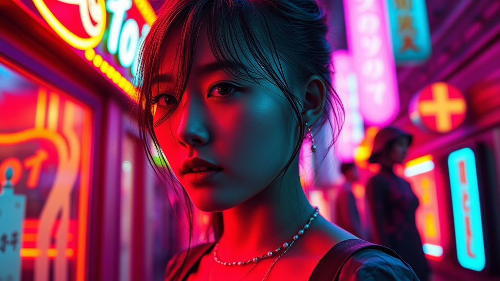 A full-length image of a woman illuminated by neon lights against a vivid backdrop, in a style that combines vray tracing and stylized portraiture. The composition features layered lines with Asian-inspired elements and hyper-realistic details, focusing on intense close-ups and contrasting shadows. The design integrates neon art nouveau with a hyper-realistic sci-fi touch, highlighted by pop art brightness and silhouette figures in light cyan and light crimson hues. The image draws inspiration from Paul Corfield’s techniques, incorporating complex layers and textures. Captured using a Fujifilm X-T4 with a Sony FE 85mm f/1.4 GM lens, the scene is rendered in a raw style, emphasizing intricate details and vivid colors.