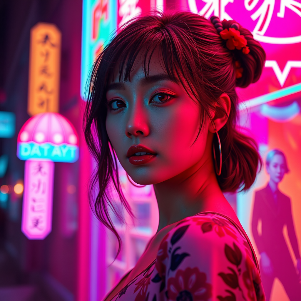 A full-length image of a woman illuminated by vibrant neon lights set against a vivid background, portrayed in the style of V-Ray tracing with a focus on stylized portraiture featuring layered lines and Asian-inspired motifs. The image showcases hyper-realistic details with intense close-ups and contrasting shadows. The aesthetic blends neon art nouveau with hyper-realistic sci-fi and pop art brightness, incorporating silhouette figures in shades of light cyan and light crimson. Drawing inspiration from the works of Paul Corfield, it features complex layers and textures. The scene is captured using a Fujifilm X-T4 and a Sony FE 85mm f/1.4 GM lens, emphasizing rich raw aesthetic qualities and intricate details.