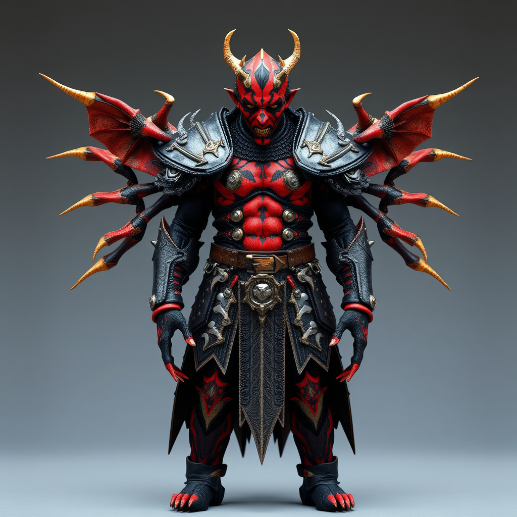 A full length photo of Darth Maul wearing armor made of elaborate dragon bones and metal plates, inspired by video game aesthetics. The image exhibits tiling effects and features poorly rendered elements like hands, feet, and face. The figure is slightly out of frame and displays mutations such as extra limbs and deformations, including crossed eyes. The body may be blurry, embodying bad anatomy, resembling a 3D render with exaggerated, disfigured features, while retaining a unique yet chaotic visual appeal.