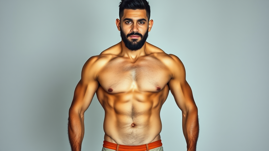 A full-length portrait capturing the full body of a strikingly handsome Cuban man, renowned for both award-winning cinematography and photography. He stands tall with an athletic, masculine build, showcasing his well-defined abs and muscular legs. His hairy chest and stubbled beard add to his rugged charm. His asymmetrical eyes contribute to his unique appeal, while he confidently poses for the camera. The photo has a wide field of view, highlighting his strong shoulders and powerful presence in a photo-realistic style.