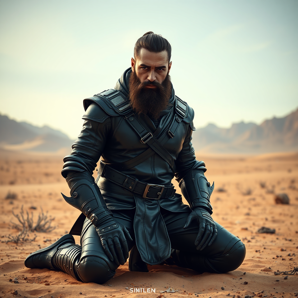 A full-length portrait of a bearded man in sleek sci-fi leather armor kneeling in a desert landscape. The setting is gothic with a focus on a detailed face, enhanced by highly detailed and cinematic lighting. The scene is captured in digital art style, focusing on character design and concept art. Elements like jpeg artifacts, distorted anatomy, extra limbs, and other abnormalities create a surreal, distorted effect, adding a unique narrative to the environment.