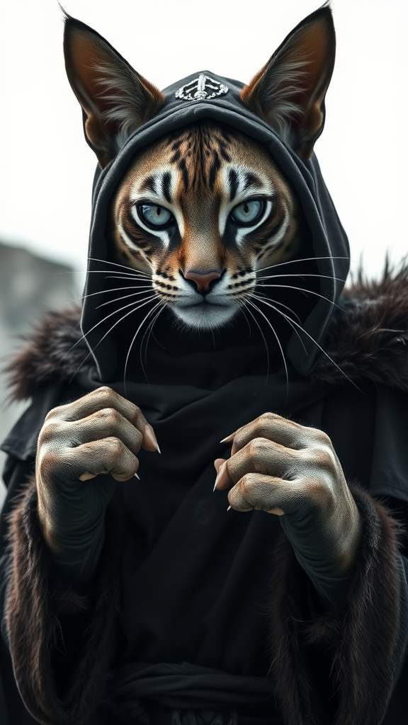 A full-length portrait of a feline-inspired character with a close-up on highly detailed facial features, displaying a flirtatious expression towards the camera. The being has a male humanoid form, clothed in obsidian druid robes with fur trimmings, standing outdoors in dramatic cinematic lighting. The pose is dynamic and intense, exuding bright energy. The intricate design appears intentionally flawed, with elements that suggest a bad artist's hand, such as awkward proportions, fused fingers, a hood with a cap, and extra ears. It's a monochrome depiction with cold colors and a simple, uninspired background that introduces subtle noise, enhancing the surreal quality.