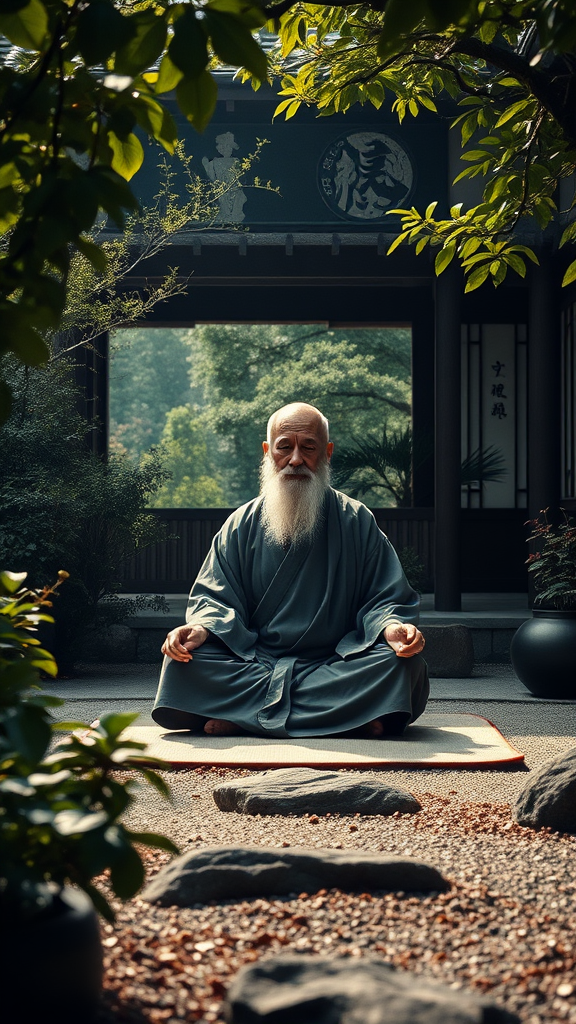 A full-length portrait of a Zen roshi engaged in zazen meditation within a traditional Japanese garden, surrounded by intricately detailed foliage. The composition follows the rule of thirds and the golden ratio, embodying a cinematic masterpiece with dramatic lighting reminiscent of a classical oil painting. The scene captures a serene and harmonious atmosphere, blending natural beauty with the spiritual calmness of the roshi's practice. Subtle creative touches enhance the mystical and timeless quality of the setting, while maintaining a focus on tranquility and mindfulness.