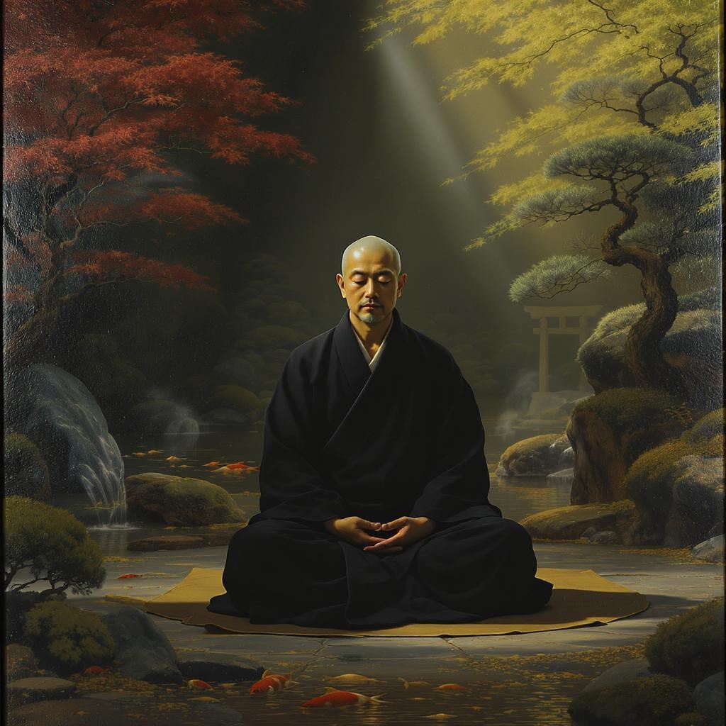 A full-length portrait of a zen roshi engaged in zazen meditation, set within a traditional Japanese garden. The scene is intricately detailed, following the rule of thirds and golden ratio, creating a cinematic masterpiece reminiscent of a classical oil painting. Dramatic lighting enhances the serene atmosphere, highlighting the intricate textures and calm demeanor of the roshi. The garden, lush and meticulously arranged, complements the contemplative pose, adding a layer of serenity and depth to the image. The composition, balanced and harmonious, captures the essence of zen philosophy and artistic beauty.