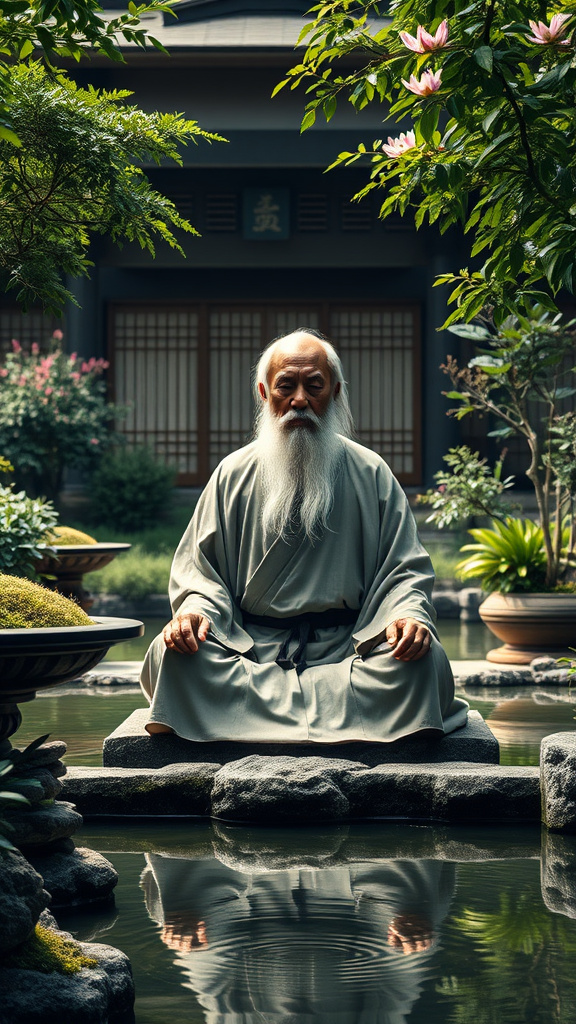 A full-length portrait of a zen roshi meditating in zazen within a traditional Japanese garden, surrounded by lush greenery and tranquil water features, intricately detailed with an emphasis on the rule of thirds and golden ratio. The scene is depicted in the style of a classical oil painting, with dramatic, cinematic lighting enhancing the serene atmosphere. Despite the aura of tranquility, subtle elements of whimsy are introduced, creating an unexpected contrast, such as the gentle play of shadows and light or an unusual pattern in the foliage, adding a touch of surrealism to the masterpiece.