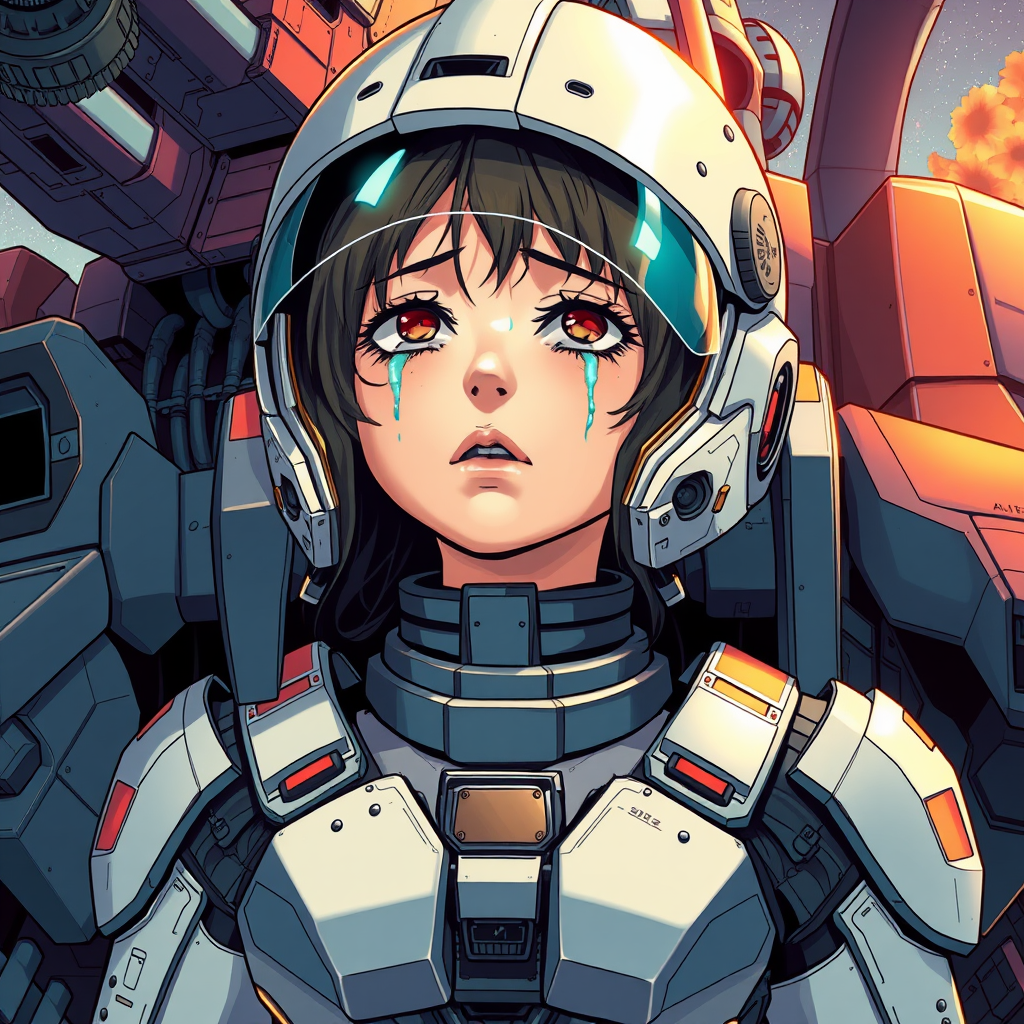 A full-length portrait of an armored astronaut girl in a comic book style, surrounded by a battlemech, showcasing highly detailed and exquisite fanart. The scene features a crying cyborg woman in vibrant, full-color, capturing the essence of manga and anime key visuals. Inspired by the works of Valerian Nartfixer and Nfixer, the artwork blends futuristic elements with emotional depth.