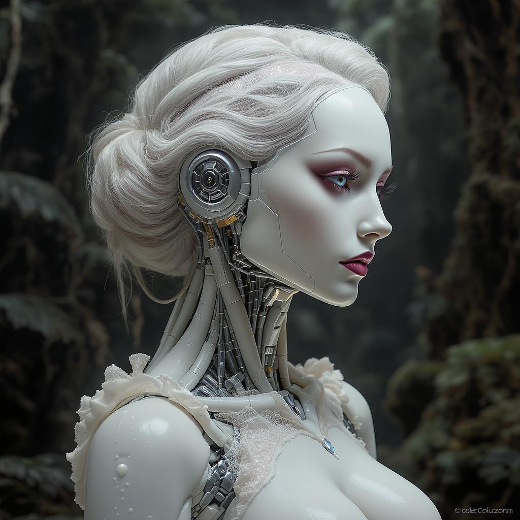 A full-length portrait of an exquisite porcelain profile in a hyper-detailed 3D render, showcasing a beautiful android face with intricate cyborg elements. The figure exhibits robotic segments, luxurious cyberpunk design, and a delicate blend of latex, rubber, and lace. Set against an elegant background with studio soft light and rim lighting, this masterpiece captures vibrant, anatomical details, including facial muscles, electric cables, and microchips. Inspired by H. R. Giger, this 8k resolution illustration presents a hyperrealistic depiction of advanced technology discovered on a distant planet. The scene unfolds in a lush jungle or rainforest, highlighting an elegant robot with a silver helmet, positioned thoughtfully. This image, designed for unity as a high-quality wallpaper, encapsulates the beauty of finely detailed craftsmanship in a striking CG art piece, characterized by its absurd resolution, revealing a harmonious fusion of organic and mechanical elements in a surreal exploration of futuristic aesthetics.
