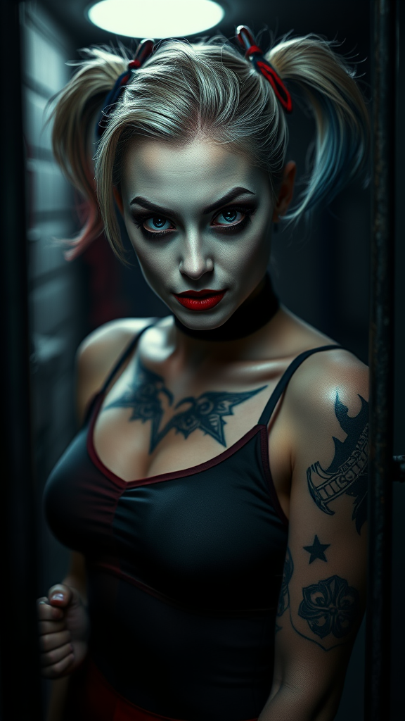 A full-length portrait of Harley Quinn, exuding an eerie intensity with a hint of rage in her eyes, her unique tattoos visible as she stands in a shadowy cell. Her piercing gaze meets the viewer under diffused soft lighting, emphasizing the hyperrealism of her detailed skin. Captured with cinematic lighting and sharp focus, the image immerses in a shallow depth of field, creating a high detail RAW color art in 8k. The scene conveys a sense of unsettling realism, akin to a photograph, maintaining sharpness despite the softness of the light, while excluding any visual noise like text, signatures, or distortions.