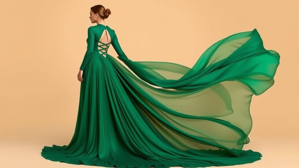 A full-length portrait showcases a woman in an elegant, flowing emerald green dress. The dress is designed with a high neckline and long sleeves, accentuated by a daring, intricate cutout at the back. The fabric sweeps down into a luxurious, floor-length train, with delicate layers and ripples that give the garment a dynamic, graceful sense of movement.
