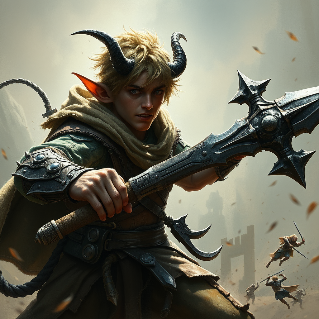 A full male body engaged in intense combat, battling an adversary wielding a colossal weapon. Inspired by the cunning halfling Pipin from Dragonlance, the scene depicts a fierce encounter. The halfling showcases agility and strategy in the skirmish. His face and eyes are detailed with photorealistic precision, capturing the intensity of the moment. The artwork, a masterpiece in 8k quality, combines the styles of Jeremy Mann, Sandra Chevrier, and Maciej Kuciara, emphasizing sharpness and realism with genuine shadows. While the figure retains a humanoid form, it features more than typical anatomical elements, including extra digits and arms, with a touch of fantasy like subtle horns. The attire is meticulously crafted, contrasting against a backdrop that evokes a sense of timeless fantasy adventure.