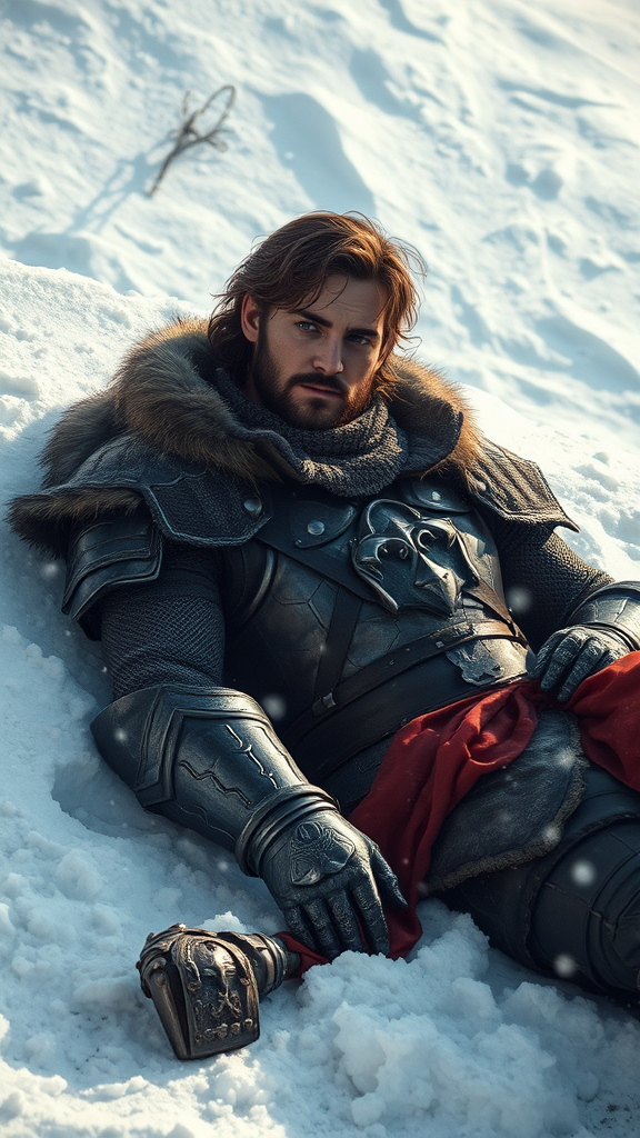 A full male body resting in the snow, portraying a scene reminiscent of Sturm from Dragonlance. A human knight of honor takes a break amidst a serene snowy landscape. His attire is rugged with detailed armor, and his face is expressive with sharp, intense eyes. The masterpiece depicts him in photorealistic 8k quality, influenced by the styles of Jeremy Mann, Sandra Chevrier, and Maciej Kuciara, showcasing a realistic shadow and 3D effect. The scene is sharp and realistic, capturing the essence of valor and rest. The setting avoids low resolution, excessive limbs, facial hair, children, inappropriate attire, cartoonish elements, and multiple horses.