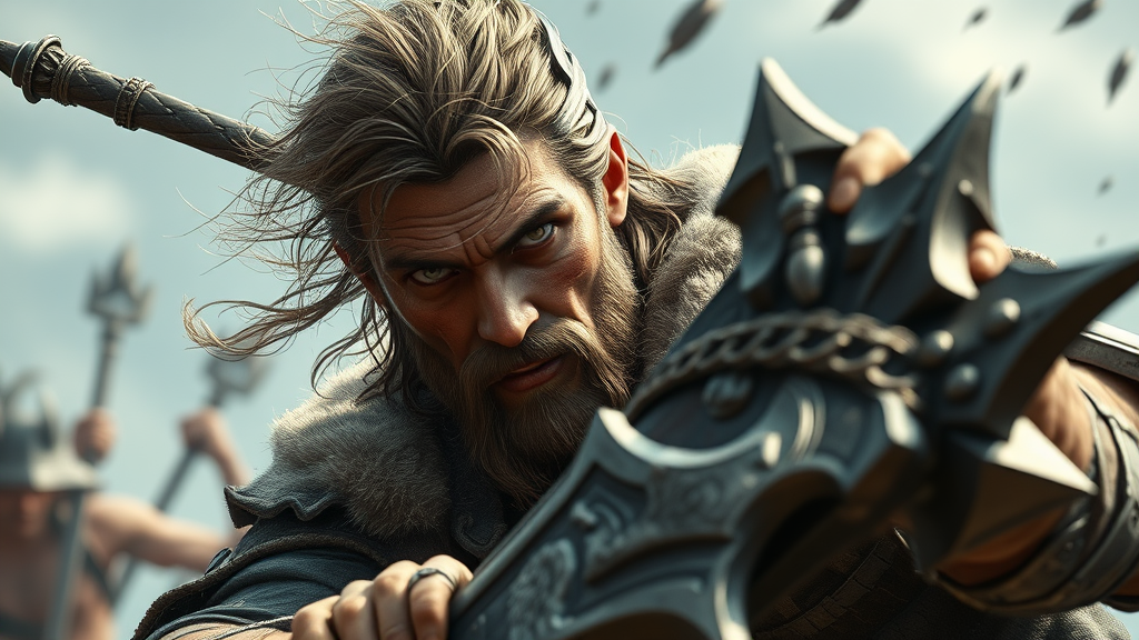 A full male human body, fiercely engaged in combat with a formidable adversary wielding an enormous weapon. The character resembles Kaelan from Dragonlance, epitomizing a devoted human cleric. The scene captures his intense engagement in the battle, with a focus on his detailed face and expressive eyes. This masterpiece of photorealistic quality is reminiscent of the works of Jeremy Mann, Sandra Chevrier, and Maciej Kuciara, showcasing sharp, realistic features with real shadows and a 3D presence. The environment is vividly alive, adding depth and intensity to the confrontation, exuding a sense of dynamic motion and immersive realism.