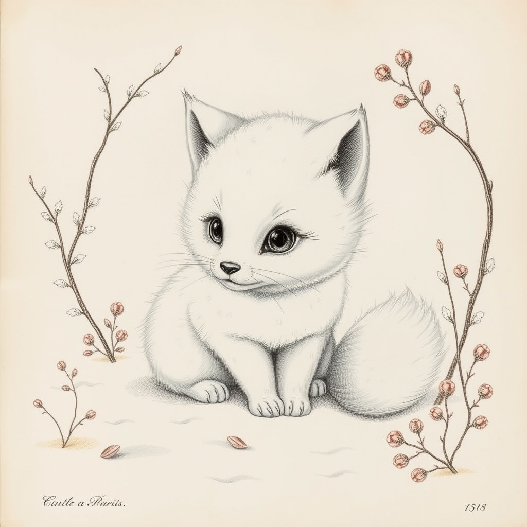A full-page antique lithograph featuring a detailed schematic illustration of an adorable white, fluffy hybrid creature, blending characteristics of a snow fox and a wild cat. The baby hybrid, with its enchanting large eyes and soft, bushy tail, sits playfully in a snowy woodland setting. Delicate sketches highlight its tufted ears, dainty paws, and a gentle expression, while surrounding botanical elements add a whimsical touch. The artwork exudes a sense of vintage charm and intricate craftsmanship, inviting the viewer into a serene and magical winter realm.