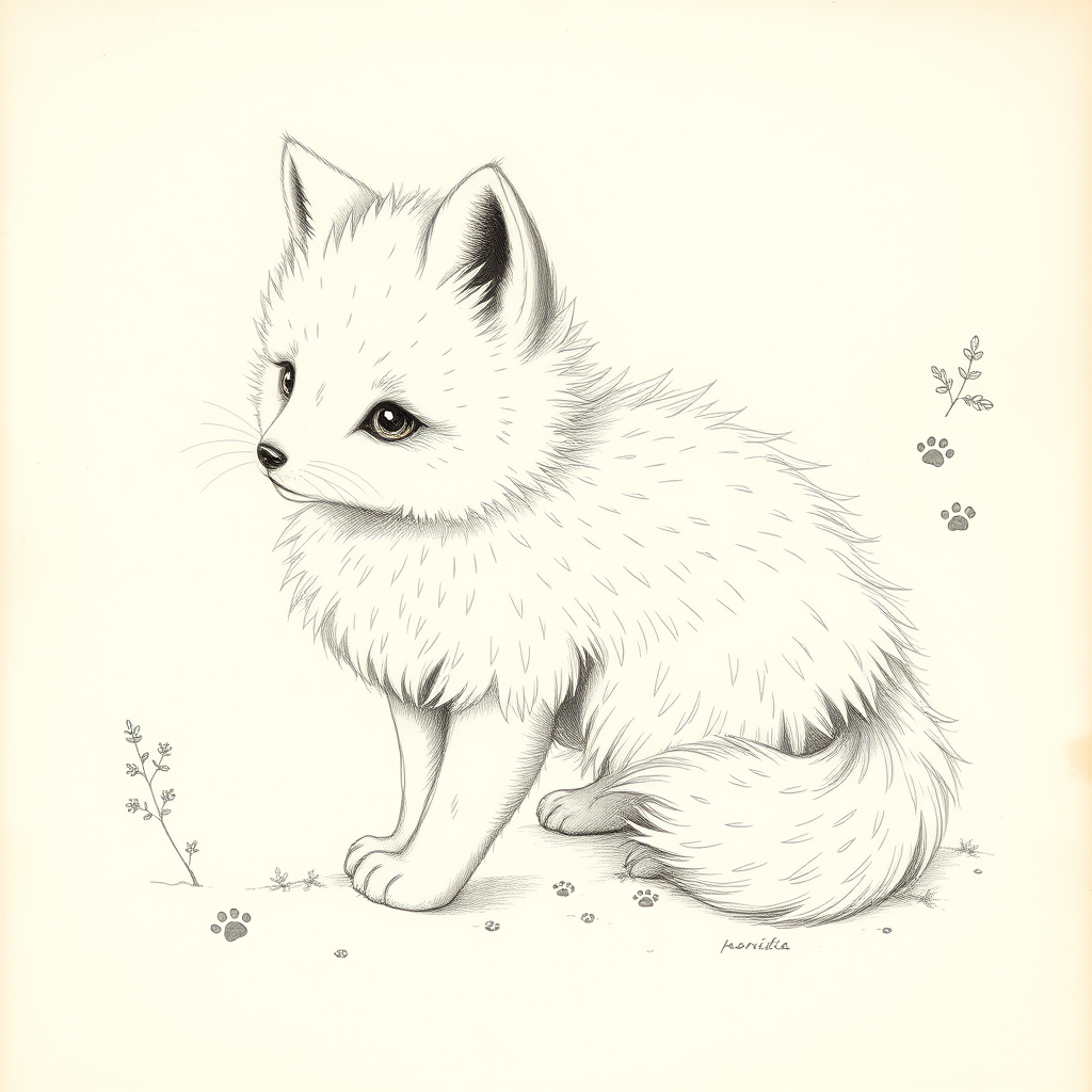 A full page antique lithograph showcasing intricate schematics of an adorable white fluffy creature that blends a wild snow fox with a kitten, capturing its baby-like innocence and playfulness. The sketch drawing features delicate details such as the gentle curl of its bushy tail, the softness of its fur, and the curious sparkle in its eyes. Small creative flourishes include subtle hints of winter flora woven into its surroundings, and tiny expressive paw prints around its form, adding a whimsical touch to the vintage-style illustration.