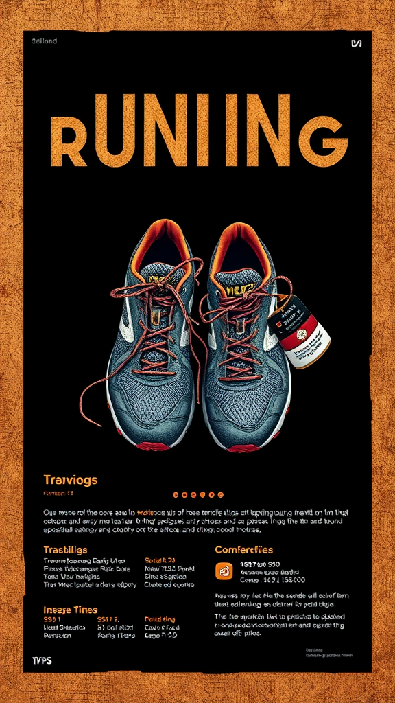 A full-page poster design showcasing a pair of running shoes with intricate details, presented on a black and bronze textured background, incorporating an infographic layout with marginalia. The artwork is intentionally designed in a low-resolution, standard quality style with visible jpeg artifacts and a subtle watermark. The shoes have quirky elements such as unusual color placements and unexpected patterns, set against a plain background, reminiscent of a "bad-artist" style with odd proportions and slightly exaggerated features.
