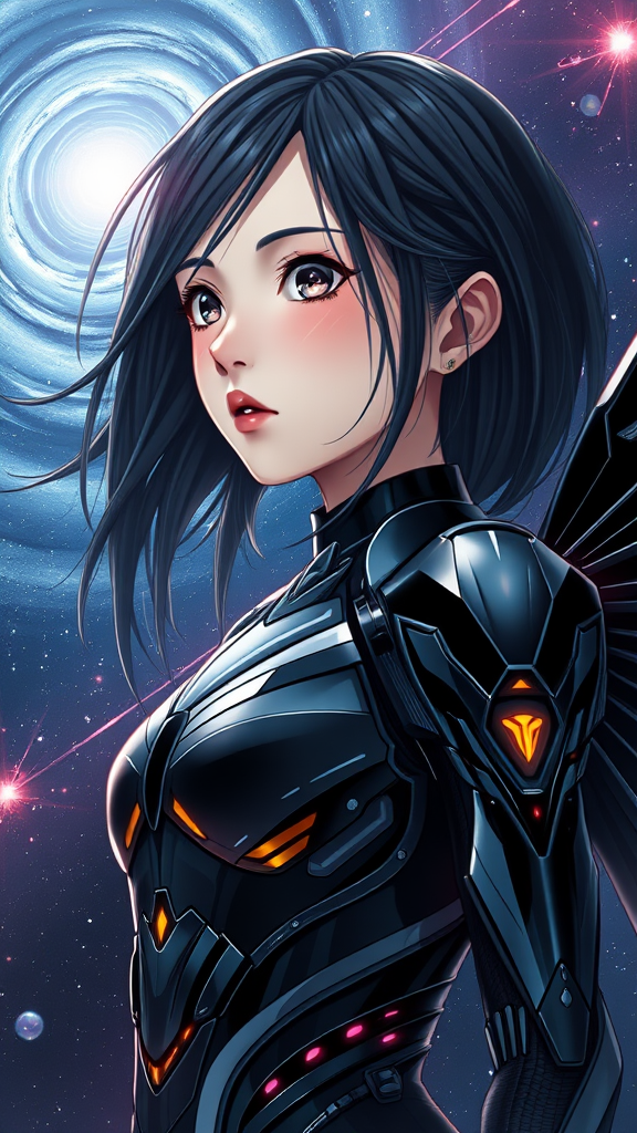 A full portrait close-up of a breathtaking girl in a sleek sci-fi exo costume, her face dreamy and captivating, framed by flowing black hair. Her slender figure is poised, gazing thoughtfully into the distance. She is adorned in a glossy black and silver intricately detailed insectoid sci-fi mech with futuristic wings. Infused with Tsutomu Nihei and Akira's stylistic influences, the scene is illuminated by the intense glow of quasar light against the vastness of outer space. The dramatic background features swirling galaxies and vibrant plasma beams, enhanced by starlight. This anime art and manga-inspired image boasts hyper-realistic detail, complex lighting effects, and volumetric graphics, presented in stunning 8K UHD resolution.