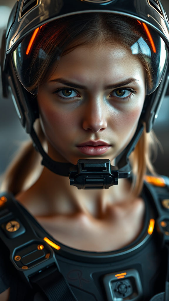A full portrait close-up three-quarter in focus showcases a stunning face with a frowning yet innocent expression. The subject is a slender athletic girl captured in a dynamic action pose, highlighting expressive features. She wears a combat exo armor suit equipped with a closed system breathing apparatus and a compact sci-fi helmet featuring a high-tech glossy transparent visor with cinematic lighting. The high-tech gear exudes a sleek futuristic style reminiscent of TV's The Expanse, with the intricate interior illuminated by neon and volumetric lighting. Shot using a Canon EOS 5D Mark IV DSLR with settings of aperture f/8, shutter speed 1/250 sec, and ISO 100, the scene boasts hyper photorealism and incredible depth of field. The lighting art further accentuates the detailed textures and natural reflections, complemented by a cinematic hair tail and the bare neck, with a hint of sticking-out hair. Bright light and gold accents accentuate the armor's symmetry and intricate design. Avoiding any imperfections, the composition maintains clarity and artistry with no distortions, extra limbs, or duplications.