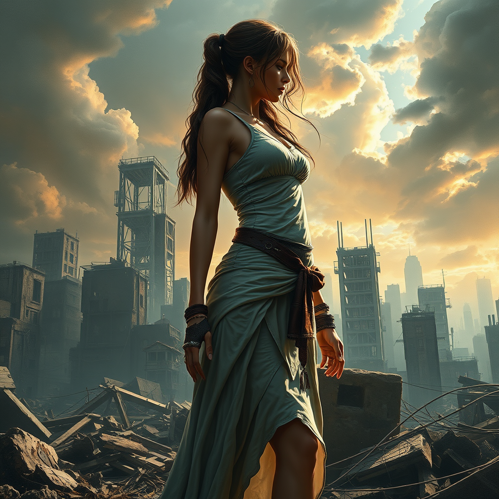 A full shot body photo of a breathtakingly beautiful artwork depicting a female post-apocalyptic woman standing amidst a destroyed cityscape, reminiscent of a majestic oil painting by Ed Blinkey, Atey Ghailan, Studio Ghibli, Jeremy Mann, Greg Manchess, and Antonio Moro. The scene is trending on ArtStation and CGSociety, showcasing an intricate and high-detail masterpiece with sharp focus and dramatic lighting. This photorealistic painting captures the essence of a midjourney and Greg Rutkowski collaboration, blending elements of cartoon and 3D art. Her limbs appear uniquely stylized, creating an artistic disconnection that adds to the allure. The textures are rich, yet no unnecessary text, watermarks, or signatures mar the canvas. The proportions are intentionally exaggerated to evoke a sense of otherworldly presence, bringing a dreamlike quality to the visual narrative. It's a digital painting that bridges the gap between Photoshop creativity and video game aesthetics, resembling a 3D render with seamless tiling and immersive depth.