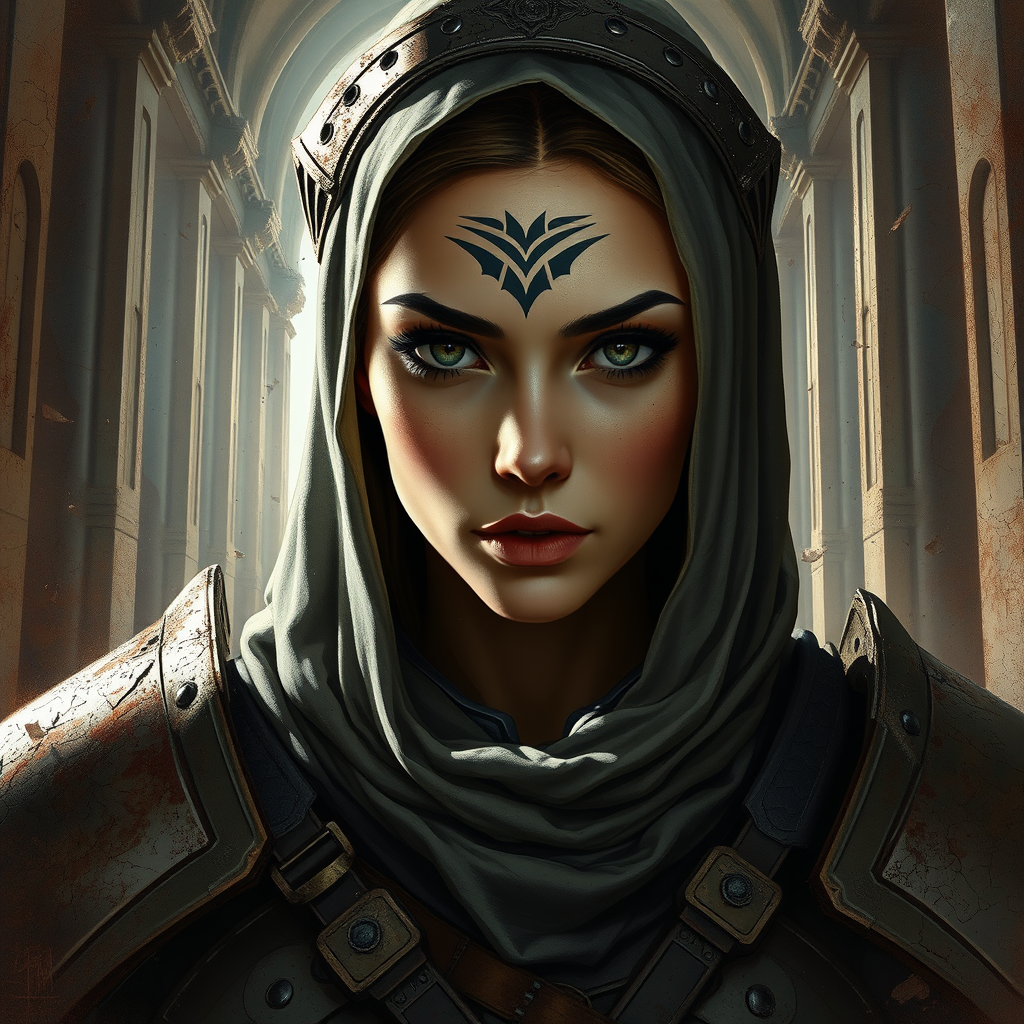 A full shot of a woman exuding immense beauty, depicted as a Sister of Battle set within a ruined cathedral. Her face is detailed with symmetrical features, reflective eyes, and dark eyebrows accentuated by mascara and makeup. She wears dirty, cracked armor reminiscent of the Warhammer 40k style. The background features marble walls in ruins, dust particles floating, and bullet-ridden, cracked surfaces. The lighting is intricate, with dramatic and rim effects. She is painted in a professional majestic impressionist style inspired by Waterhouse, John Constable, Ed Blinkey, Atey Ghailan, Jeremy Mann, Greg Manchess, and Antonio Moro, and is trending on ArtStation and CGSociety for its high detail and dramatic quality. The woman has a forehead tattoo and wears a veil and hat that complement her steel armor. The atmosphere is intensely artistic, capturing the essence of strength and beauty within chaos.