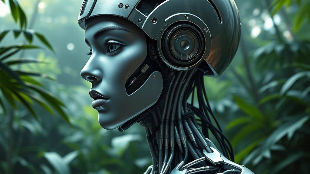 A full whole body from head to toes portrait of a stunning porcelain profile android face with intricate cyborg and robotic components, rendered in complex 3d with exceptional detail. The scene captures the beauty of luxurious cyberpunk aesthetics, with elements like latex, rubber, lace, and visible anatomical details such as facial muscles, electric wires, and microchips. Set in a beautifully lit studio with soft and rim lighting, creating vibrant, high-quality 8k visuals reminiscent of H. R. Giger's style. The android, kneeling elegantly, symbolizes a futuristic world where consciousness can be downloaded into robotic forms. Surrounded by a lush jungle rainforest background, the scene is painted with bright colors while maintaining hyperrealism. Created with advanced CG techniques, the composition is a masterpiece illustrating unity and innovation, with silver helmet and full-bodied intricacies, ensuring a visually stunning, absurdly detailed piece of art that maintains its core essence of futuristic elegance.