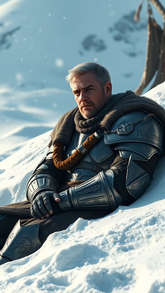 A fully armored male figure rests calmly in a snowy landscape, embodying the noble spirit of Sturm from Dragonlance, a human knight known for his honor and valor. The scene captures him taking a serene break amidst the pristine snow, his detailed face and expressive eyes conveying strength and tranquility. Created with the highest quality, the image is an 8k photorealistic masterpiece, reminiscent of the styles of Jeremy Mann, Sandra Chevrier, and Maciej Kuciara. The sharp realism is enhanced by real shadows and a 3D effect, showcasing the knight's intricate armor and the snow's texture. This visual keeps the essence intact while adding a touch of artistic creativity. The environment and character remain grounded and realistic, avoiding any fantastical or exaggerated elements.