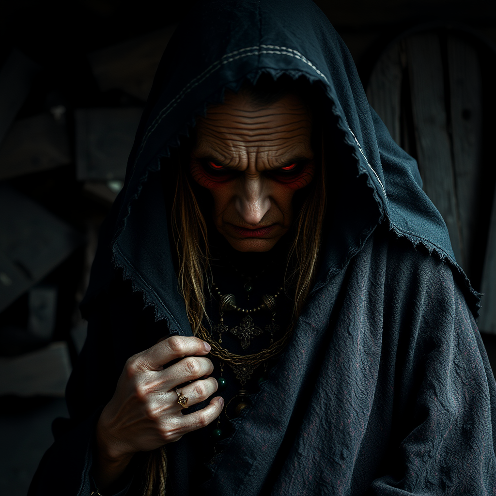 A furious, ancient sorceress resides in a sinister, decrepit cabin, draped in a ragged, soiled ebony cloak. Her weathered face bears deep creases, and her eyes glow a menacing crimson. She is adorned with eerie talismans and occult jewelry, exuding an aura of malevolent magic. Her presence is foreboding and unholy, steeped in dread and darkness. The setting is rich in intricate patterns and unsettling detail, captured in dramatic, cinematic lighting, achieving a photorealistic effect with an 8k resolution, maintaining a vertical 9:16 aspect ratio.
