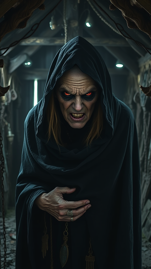 A furious, ancient witch with a malevolent aura stands inside a sinister, decrepit hut, wrapped in a grimy, worn black cloak. Her face is deeply wrinkled, eyes a fiery crimson, exuding an aura of dark magic. She's adorned with eerie, occult jewelry. The atmosphere is demonic and unholy, evoking a chilling horror. The setting is shrouded in darkness, with a labyrinth of intricate design and detail. The scene is bathed in dramatic, moody lighting, achieving a photorealistic, cinematic quality, presented in stunning 8k resolution, capturing every nuance of the nightmarish ambiance.