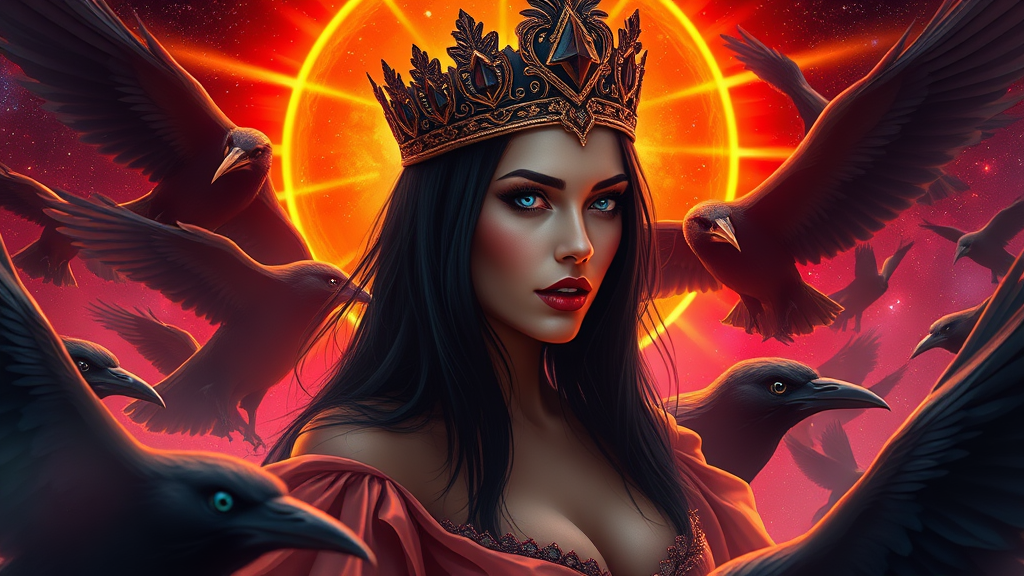A furious, captivating queen of ravens enveloped in a golden aurora, commanding her avian subjects with an intensity that drips with bloodlust. Her icy blue eyes, edged with the deep hue of Pantone 2766, glisten beneath a crown embellished with ethereal intricacies. Her sleek black hair cascades down her shoulders, matched by the flowing elegance of a silk gossamer dress that sways with her every move. Lips painted a vivid red, she is the embodiment of a femme fatale, orchestrating the dance of ravens around her. The backdrop is a breathtaking tapestry of stars and galaxy, with radiant god rays piercing the scene, lending an atmospheric hyper-realism that draws from the visual grandeur of a World of Warcraft universe. Psychedelic hues weave through the macabre landscape, an iridescent red halo framing the spectacle. The environment, captured in sharp focus through an octane render, is as ultra-realistic as it is epic, echoing the cinematic flair of a Greg Rutkowski-style masterpiece. An intricate low-angle shot magnifies her commanding presence, making the scene both a dramatic and mesmerizing full-body portrait.