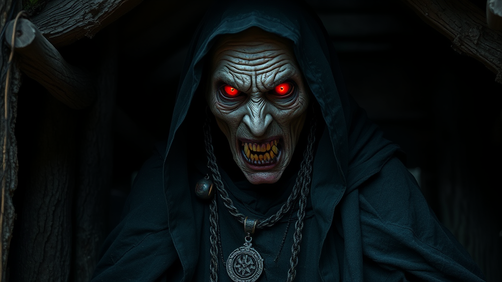 A furious demonic crone inside a shadowy, decrepit hut, draped in a grimy, worn-out black cloak, her deeply lined face boasting glowing red eyes. She is adorned with sinister black magic trinkets, exuding an eerie, unhallowed aura. The scene is enveloped in a chilling, horror-infused atmosphere with a richly detailed and intricate design. The setting is captured with dramatic, cinematic lighting, achieving a photorealistic quality in stunning 8k resolution, emphasizing the sinister allure and macabre elegance of the scene.