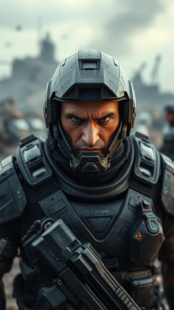 A furious marine clad in advanced combat armor stands resolute amidst a futuristic, apocalyptic war-torn landscape, locking eyes with the viewer. The portrait captures every intricate detail of his skin with hyper-realistic precision, set against a backdrop of destruction. The scene is composed with 8k resolution, utilizing full-length framing, rich RAW colors, and diffused soft lighting to create a sense of depth and texture through shallow depth of field and razor-sharp focus. The atmosphere is further enhanced by cinematic lighting and sophisticated CGI elements. The image maintains clarity and structure, avoiding any blurs, distortions, or anatomical inaccuracies, presenting a compelling and immersive portrayal of resilience amidst chaos.