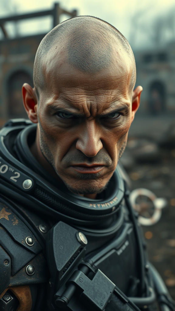 A furious marine clad in cutting-edge combat armor stands against a backdrop of a post-apocalyptic war-torn landscape, eyes locked intensely on the viewer. The scene captures a portrait-oriented, full-length view with meticulous detail in high-resolution 8k. The marine's skin showcases intricate realism, enhanced by diffused, soft lighting and a shallow depth of field, ensuring a sharp focus. The setting employs hyperrealistic and cinematic CGI lighting to emphasize the marine's grit and determination. The image reflects a blend of sharp 3D artistry, without compromising on detail or quality, avoiding imperfections like cropped elements, errors, or distortions, maintaining natural anatomy and proportions, free of artifacts or deformities.