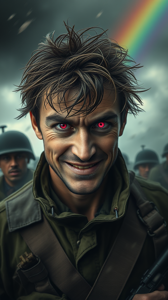 A furious soldier with disheveled hair and clear, intense eyes stands amidst a dark, stormy environment. His pink eyes gleam with a touch of madness, creating a gorgeous yet unsettling sight. The scene is so detailed and hyper-realistic, it feels like a photograph capturing the peak of human emotion. Despite the absurd and stupid circumstances around him, he smiles a strange, smooth smile, highlighting his inner conflict. The chaotic ambiance is reminiscent of an old painting filled with absurd proportions and bizarre mutations. The environment around him is stunning, with a rainbow slicing through the stormy sky, a surreal contrast to the soldier’s messy, slightly embarrassed demeanor. Despite the sloppy feel of the transformed scene, the intricate details present an ultra-realistic view of this strange and cloned vision, where reality and absurdity blur into a blurry, stunningly bizarre photograph.