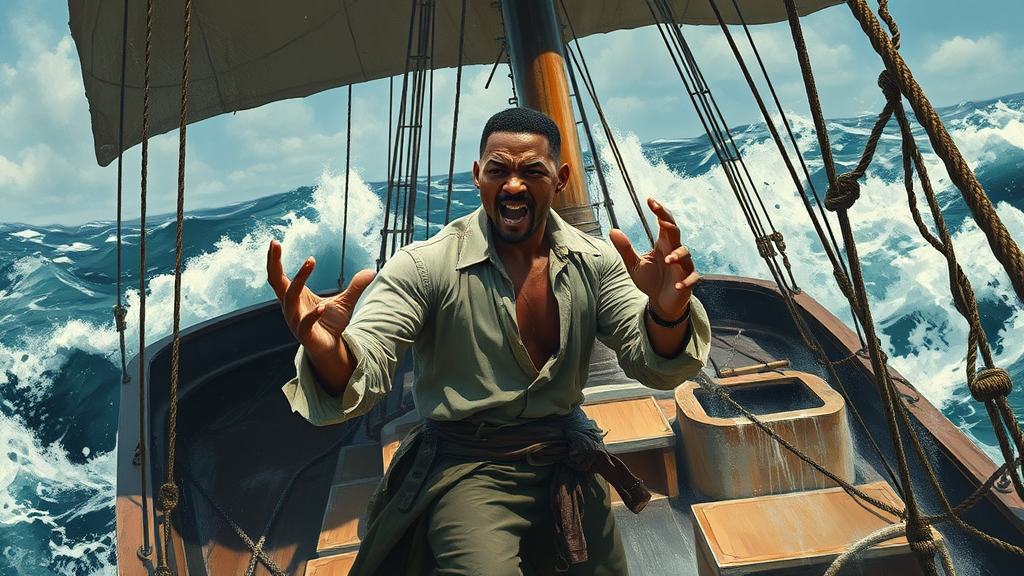 A furious Will Smith, his hands animated in a whirlwind of emotion, stands amid the tumult of a pirate ship swaying across the tumultuous high seas; the vessel is painted with broad strokes of porpoise grey, flint black, and fossil beige, its deck awash with charcoal shadows and stark patches of brilliant white under the glaring sun; the scene vibrates with an intensity reminiscent of Fauvism and Expressionism, capturing the raw visceral energy of the moment amidst the vivid, turbulent ocean backdrop.