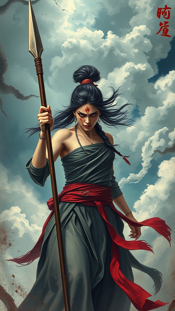 A furious woman with a spear, her face streaked with blood, stands under a detailed, tumultuous sky. Embodying a warrior from Chinese mythology, she exudes fierce determination amidst swirling clouds, her figure framed by an abstract, ethereal backdrop.