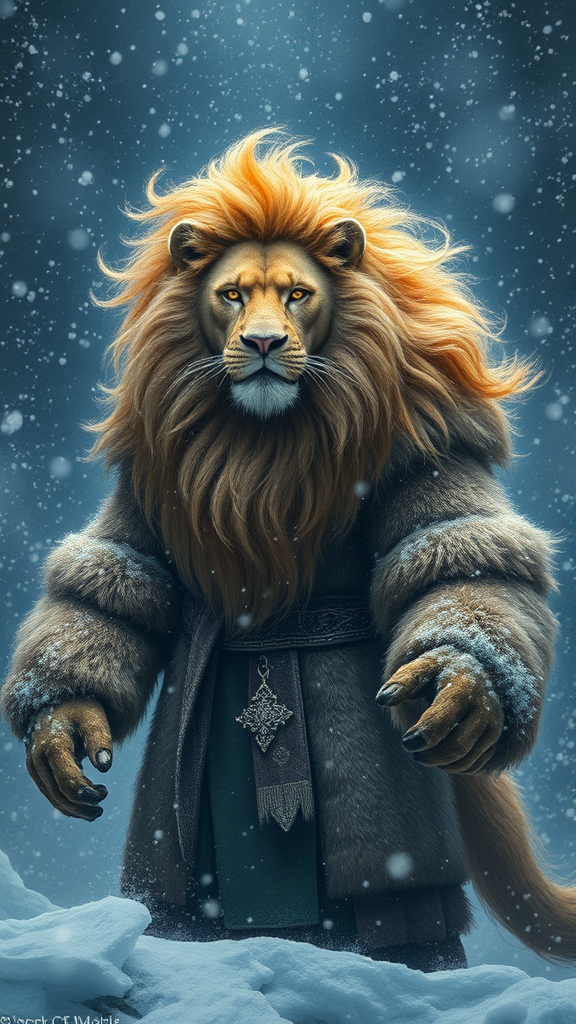 A fusion between a man and a lion emerges, standing tall against the relentless blizzard that swirls through the winter night. His powerful form is draped in thick, luxurious furs, blending seamlessly into the icy landscape. The creature's golden mane billows with the wind, contrasting against the silver flakes of snow that dance around him. His eyes, a mix of human intelligence and feline ferocity, pierce through the darkness, revealing his dual nature. The scene, imbued with fantasy, captures the ethereal and primal essence of Greg Rutkowski's imaginative style.