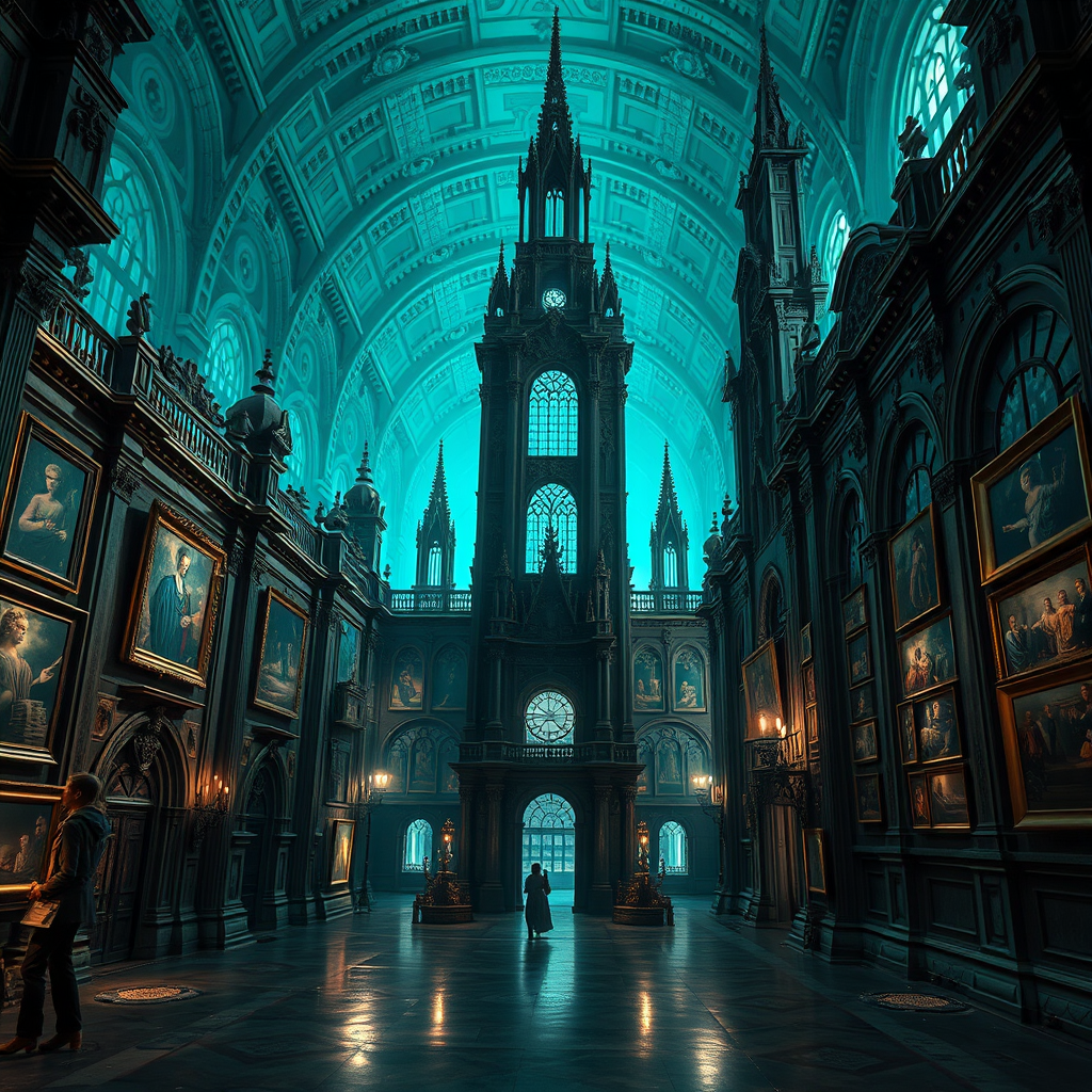 A fusion of the finest art galleries, envisioned through the surreal lens of Oliver Wetter and Alberto Seveso, set in a cyberpunk dystopia illuminated with dark bronze and cyan hues. Intricate architectures rise like futuristic cathedrals, their details echoing the powerful strokes of Artemisia Gentileschi. Shadows play in dark gray tones, intertwined with whispers of light aquamarine, creating a hauntingly beautiful atmosphere that evokes both awe and introspection.