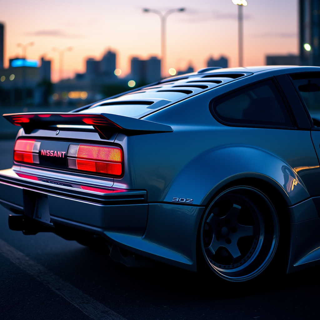 A futuristic 1984 Nissan 300ZX with an aggressive wide body kit featuring sleek vents, custom LED tail lights glowing with modern flair, subtle carbon fiber accents complementing its aerodynamic design, captured through the lens of a Canon D500 to emphasize its dynamic form. The image is shot on Portra 200 film in RAW, exhibiting a vivid yet classic aesthetic. Additionally, the car's body boasts subtle holographic details that shift in color under light, nodding to its futuristic essence while respecting the iconic silhouette and essence of the original model. The setting is an urban landscape at dusk, with city lights reflecting off its polished surface, highlighting the innovative blend of retro and futuristic design elements.