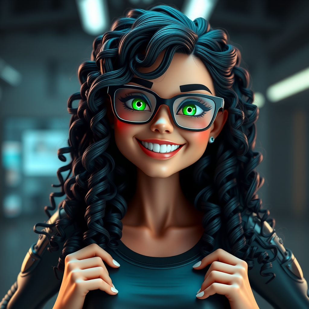 A futuristic 3D cybergirl with a joyful expression, her hands confidently placed on her hips. She wears sleek glasses that highlight her vibrant green eyes. Her long, curly, jet-black hair cascades around her highly detailed face. The scene is rich in detail and rendered in 8k, featuring a bright, front-facing light that accentuates her features. The cybergirl's design is in ultra-detail, showcasing a cutting-edge style without any background, allowing her vivacious personality and futuristic elements to stand out prominently.