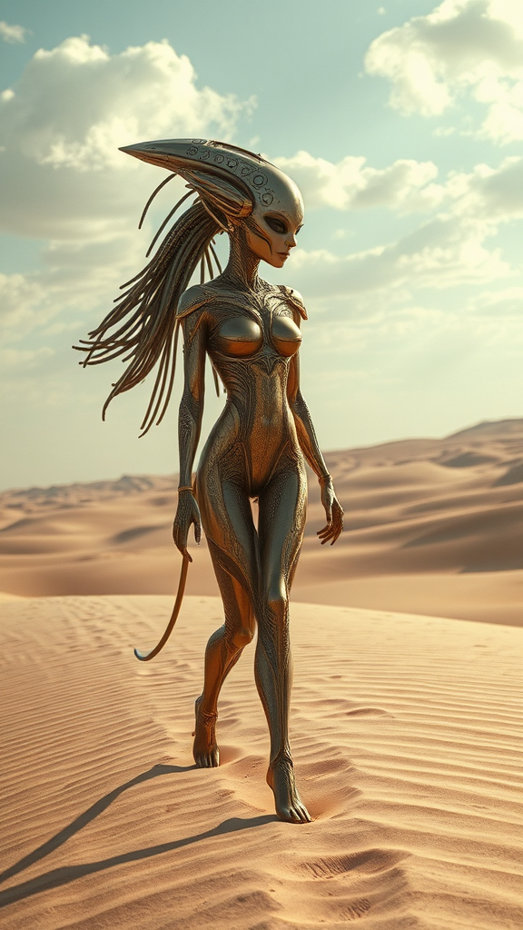 A futuristic alien creature traverses the desert landscape, exuding an aura of glamour with dark beige and shimmering gold tones. The expansive skies above her are a canvas of solarpunk artistry, while her surrealistic poses captivate the imagination. She resembles an alien woman, her form harmonizing with the sophisticated design of elaborate spacecrafts. The scene is rich in detail, with a low depth of field enhancing the mesmerizing effect. Her figure, highly detailed, appears in hues of light bronze and gold. The composition blends the realism of craola art style, crafting a vivid and immersive vision of otherworldly grace amidst the sands.