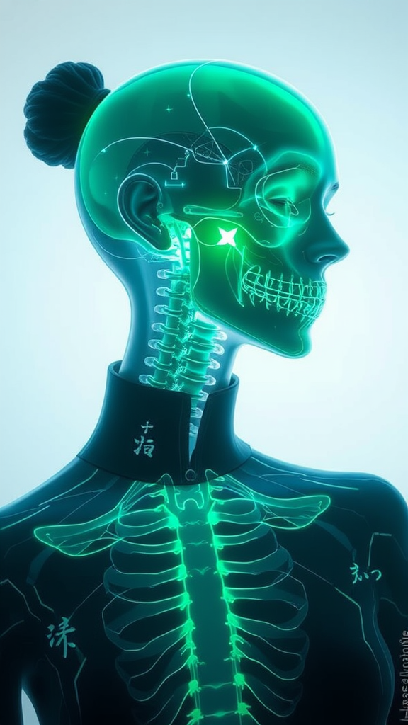 A futuristic and ethereal portrait of a woman with translucent skin revealing her skull, inspired by Japanese cyberpunk aesthetics. She emits a neon green bioluminescent glow, reminiscent of Tokyo's night neons. Her profile is accentuated by a sleek, high-collared black outfit adorned with Japanese-inspired technological motifs. Around her, subtle holograms of kanji symbols float, blending tradition with futurism. The background features a misty white gradient suggesting a cybernetic city shrouded in fog, enhancing a surreal and high-tech ambiance. The lighting, a cold and futuristic blue, delicately illuminates her bone structure, creating an x-ray vision effect. Rendered in Unreal Engine 5, with soft textures, holographic effects, and cinematic lighting, combining minimalist simplicity with hyper-realism in a sophisticated Japanese cyberpunk style.