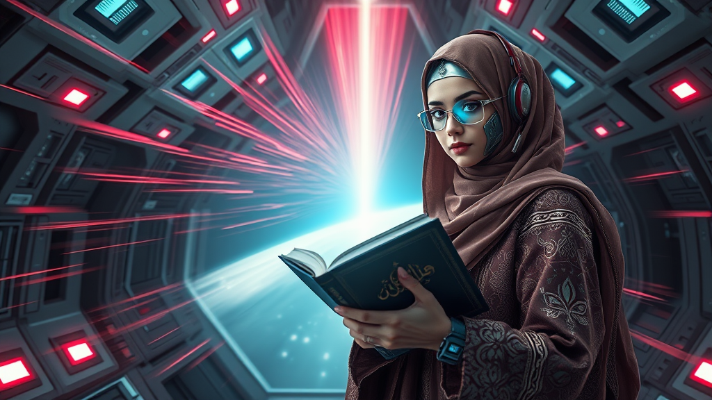 A futuristic and hyper-realistic depiction of a charming hijabi girl with cyberpunk-inspired prosthetics, holding a Quran. She's dressed in elaborate Islamic attire and has long, flowing hair. The scene unfolds inside a spaceship, presenting a blend of sci-fi aesthetics and hyper-detailed design elements. A striking laser beam emanates from the center, aligned with a laser descending from the sky, creating dynamic energy patterns. The composition offers a photorealistic and cinematic experience, with a focus on acceleration and dazzling light flashes. The detailed textures are captured in 8K, HD, providing super-resolution clarity, and are portrayed with a sense of speed and fluidity, employing long exposure techniques for dramatic effect.